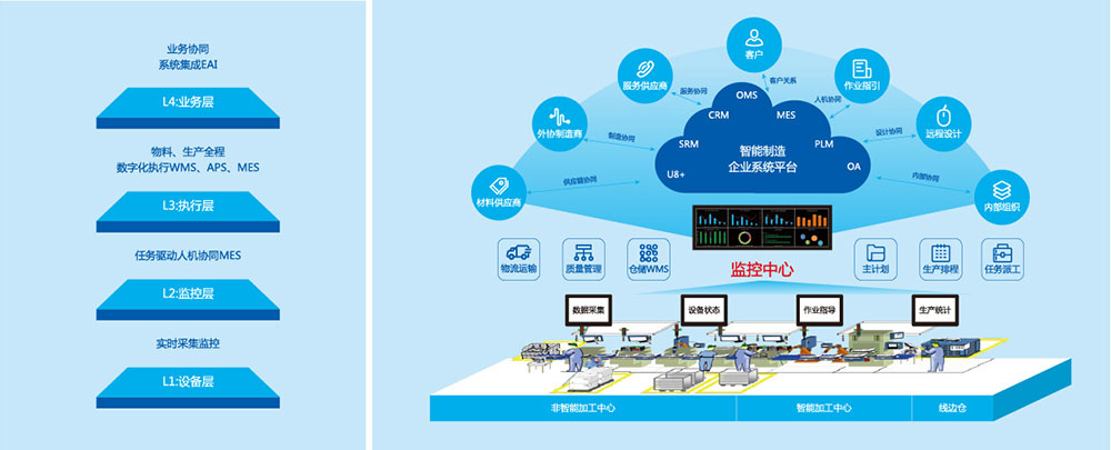 智能制造不但要生產(chǎn)自動化、信息化,更需跨業(yè)務(wù)層級整合信息系統(tǒng),實現(xiàn)業(yè)務(wù)層、執(zhí)行層、監(jiān)控層、設(shè)備層的互聯(lián)互通。MES系統(tǒng)是鏈接業(yè)務(wù)層與設(shè)備監(jiān)控層的橋梁,通過MES可以實時掌控生產(chǎn)進度與監(jiān)控異常。