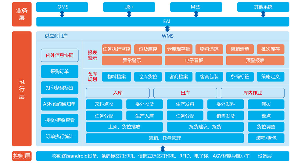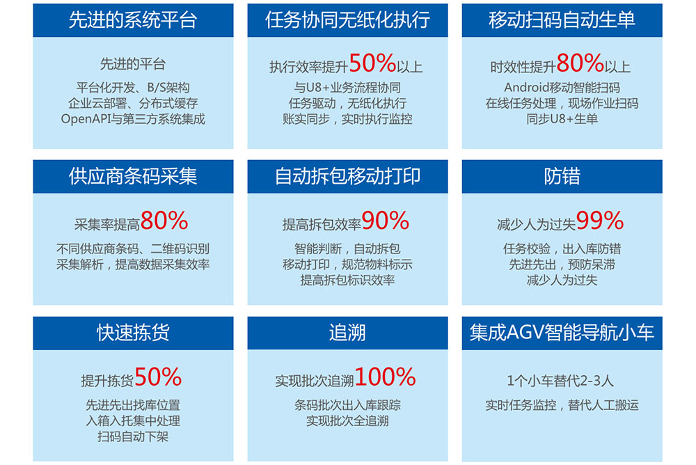 公司技術(shù)WMS倉儲執(zhí)行管理系統(tǒng)采用最新的信息網(wǎng)絡(luò)技術(shù),通過條碼/RFID技術(shù)、移動打印、二維碼解析、AGV智能導(dǎo)航小車及先進生產(chǎn)管理理念,能夠有效的對倉庫流程和空間利用進行管理,實現(xiàn)最小包裝跟蹤管理、批次管理、先進先出管理、快速掃碼出入庫和動態(tài)盤點,提高企業(yè)倉庫空間利用率及員工工作效率。